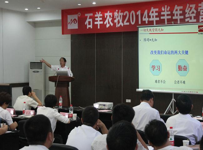 7月3日,石羊集團農(nóng)牧產(chǎn)業(yè)2014年上半年經(jīng)營檢討會在臨潼隆重召開。集團總裁常青山、集團副總裁兼農(nóng)牧公司總經(jīng)理韓春元出席會議,各事業(yè)部總經(jīng)理、各線路負責人、各子分公司副總經(jīng)理以上人員及財務線路近百人參加會議。