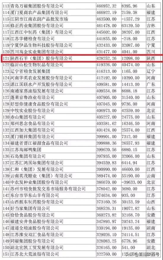 陜西上榜的七家企業(yè)中,陜西石羊集團(tuán)排名最高,位居第121位,營業(yè)收入為42.82億元,其次為西安國維淀粉,排名230位,營業(yè)收入21.02億元。此外,陜西恒通果汁營業(yè)收入17.13億元,排名第275位;陜富面業(yè)營業(yè)收入17.09億元,排名276位;西安銀橋乳業(yè)營業(yè)收入15.49億元,排名第293位;陜西海升果業(yè)營業(yè)收入15.07億元,排名第301位;陜西恒興果汁營業(yè)收入7.90億元,排名第455位。