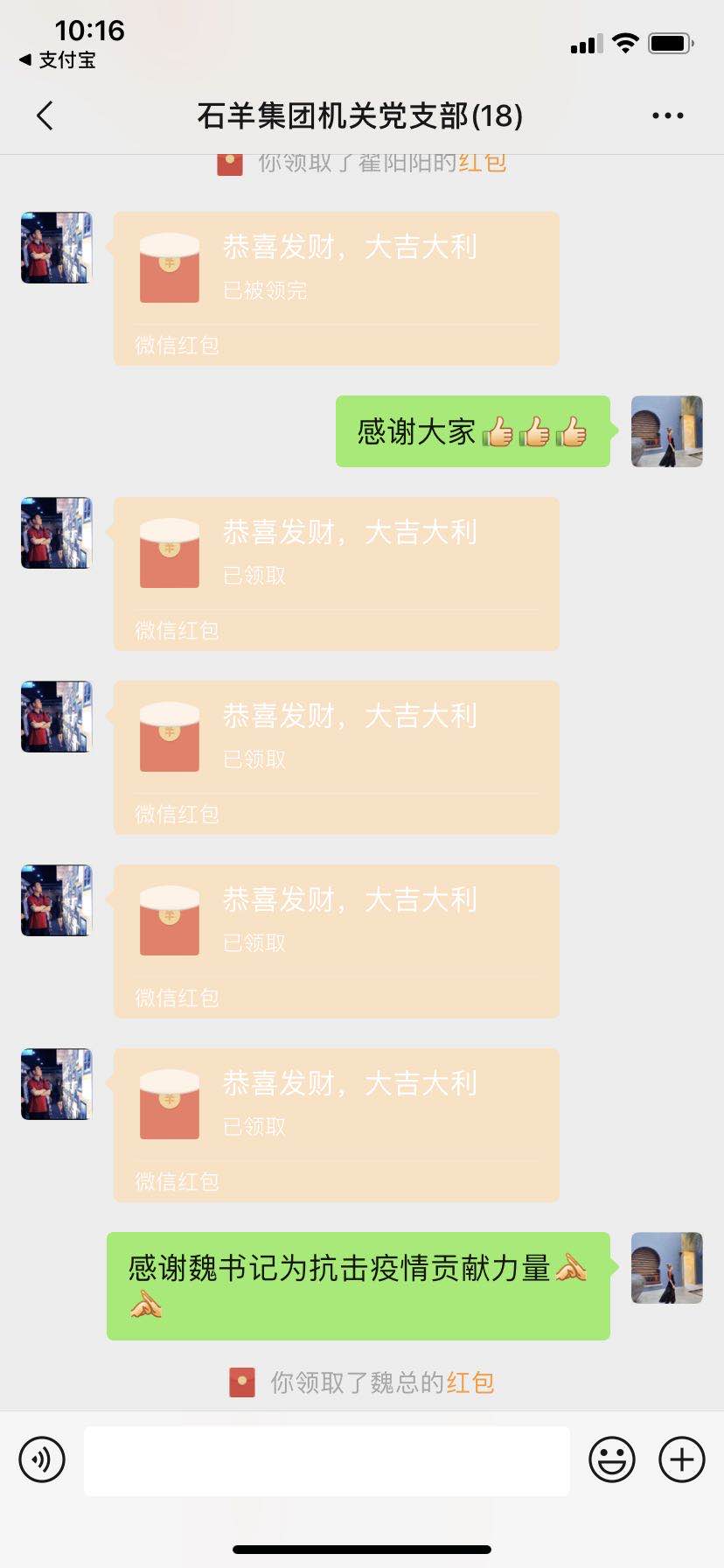 疫情就是命令,防控就是責(zé)任。危難時刻,共產(chǎn)黨員就應(yīng)該沖鋒在前。2月28日上午,石羊集團黨委下發(fā)《關(guān)于做好黨員自愿捐款支援新冠疫情防控工作的通知》,通知發(fā)出后,全體黨員和入黨積極分子踴躍響應(yīng),積極行動自愿繳納這份“特殊黨費”,為疫情防控貢獻力量,踐行石羊愛心和擔(dān)當(dāng)。
