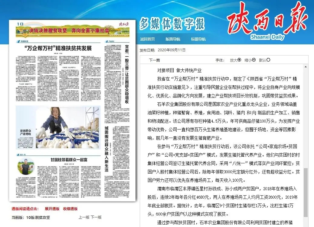 9月11日,陜西日?qǐng)?bào)刊登題為《“萬(wàn)企幫萬(wàn)村”精準(zhǔn)扶貧共發(fā)展》報(bào)道。