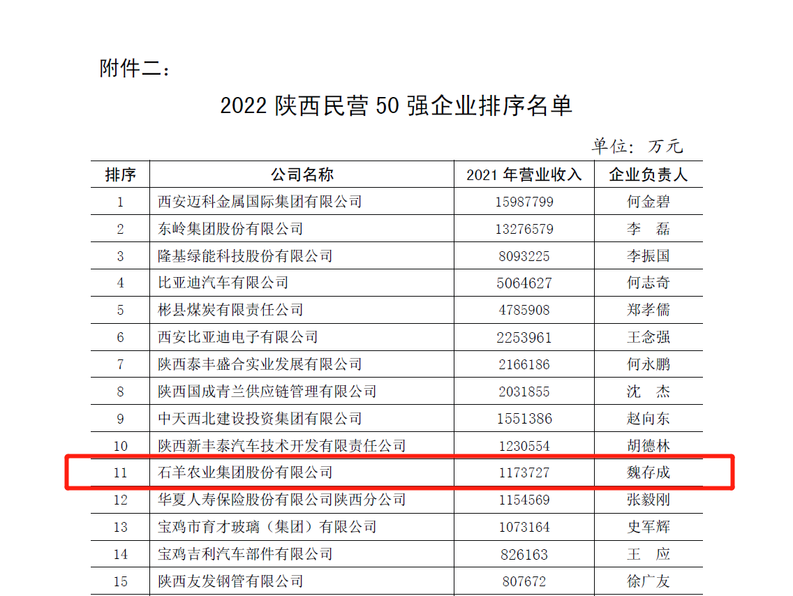 12月18日,由陜西省企業(yè)家協(xié)會牽頭開展的2022年度陜西百強企業(yè)排序工作已經(jīng)順利完成,并官方公布。石羊集團以年收入117億元榮登“2022陜西100強企業(yè)”榜單第43位,較去年上升2位。