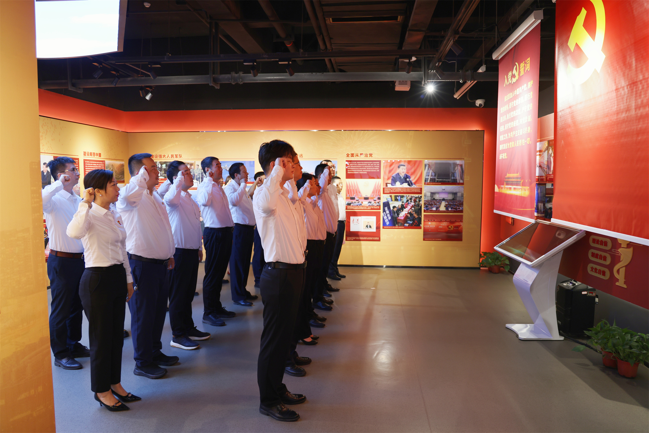 基地參觀結(jié)束后,全體黨員舉行入黨誓詞重溫儀式。“我志愿加入中國共產(chǎn)黨,擁護黨的綱領,遵守黨的章程,履行黨員義務……”參會的全體黨員和6名預備黨員共同宣誓,鏗鏘有力的誓詞響徹整個基地。隨后舉行頌紅歌活動,全體黨員滿懷深情,用洪亮而堅定的聲音唱響經(jīng)典紅歌《沒有共產(chǎn)黨就沒有新中國》《團結(jié)就是力量》,那熟悉的旋律中,飽含著黨員對黨和國家的深厚感情,以及對革命先輩的崇高敬意。